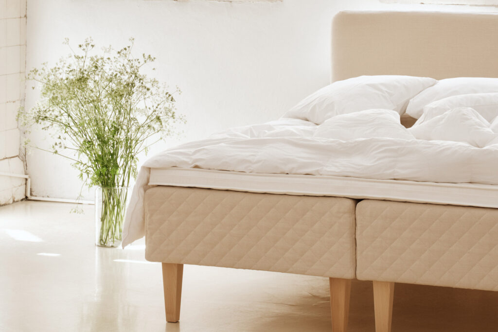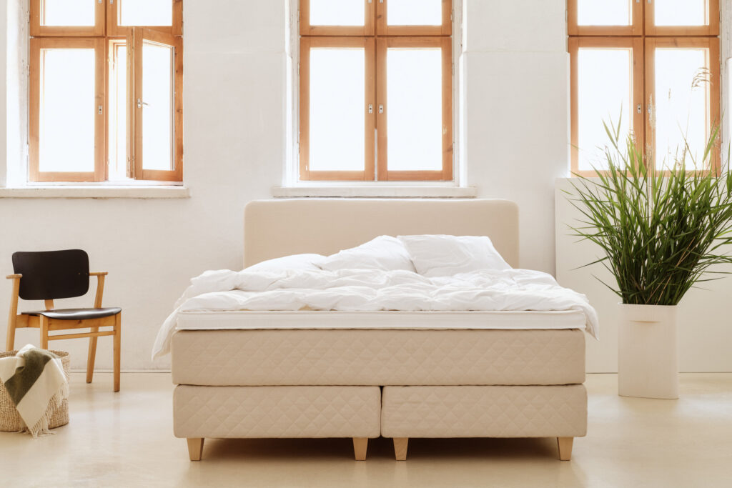 In einem skandinavischen Boxspringbett befindet sich die komplette Federung im Boxspringbett, es kommt ohne zusätzliche Matratze aus. Es erfordert die Verwendung eines Toppers, der den Liegekomfort erhöht und das Beziehen erleichtert.