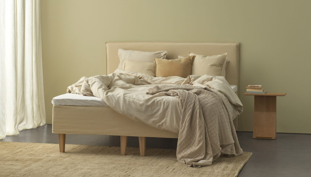 Beige Bettwäschebezug für Boxspringbett, passend zu skandinavischem Schlafzimmerdesign und hochwertigem Schlafkomfort.
